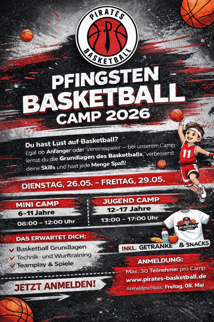 In den Pfingstferien veranstalten die BG Bodensee Pirates ihr erstes Basketballcamp für Kinder und Jugendliche. Das Camp richtet sich an alle basketballbegeisterten Kinder – egal ob Anfänger oder Vereinsspieler und findet in der Sporthalle Fischbach statt.
